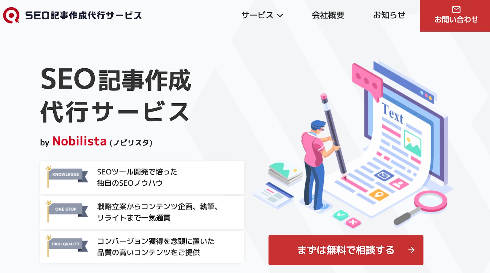 当サービスは、クラウド型検索順位チェックツール「Nobilista(ノビリスタ)」の運営メンバーや、社内のSEOチームによる、記事作成代行サービスです。