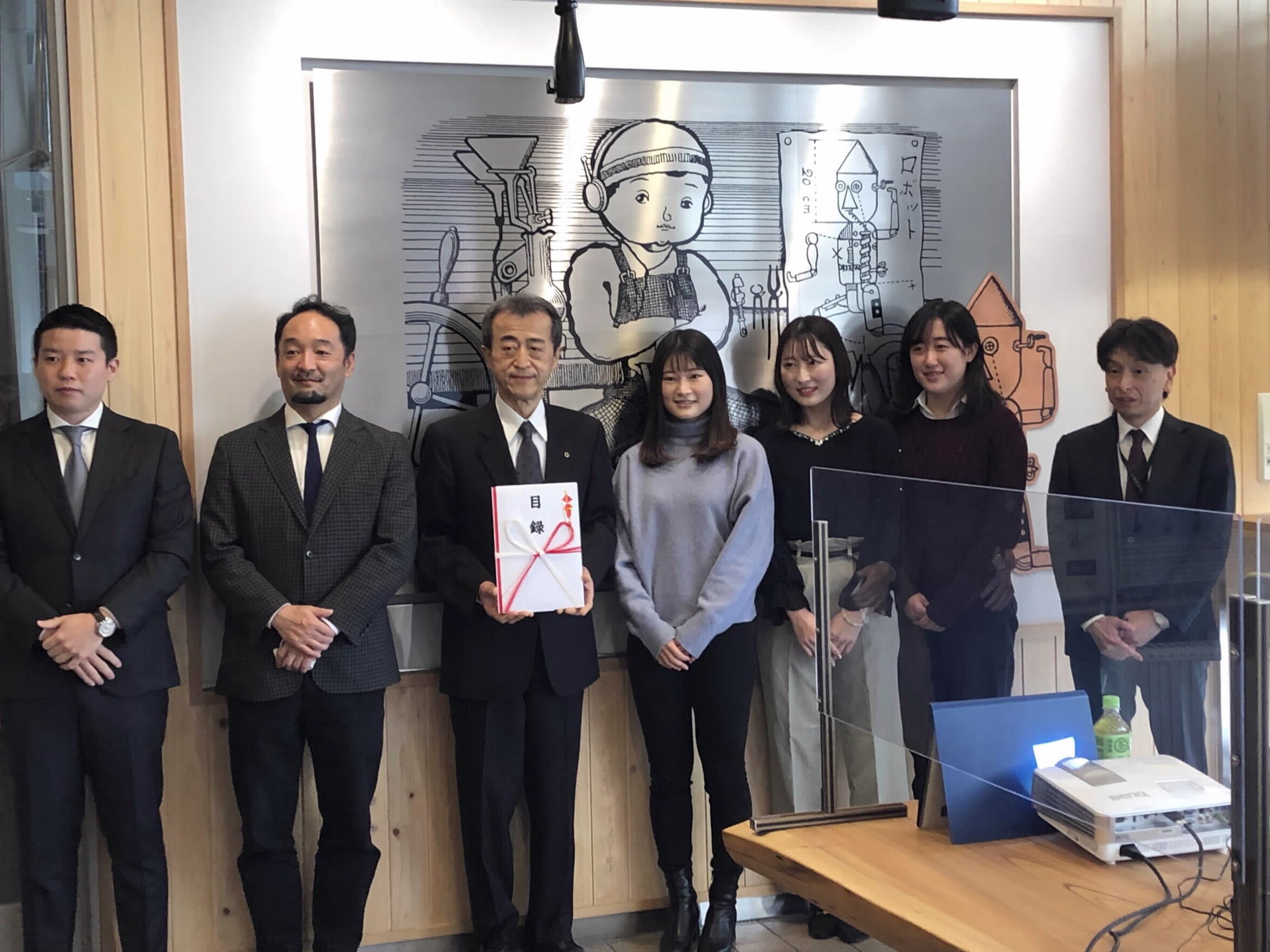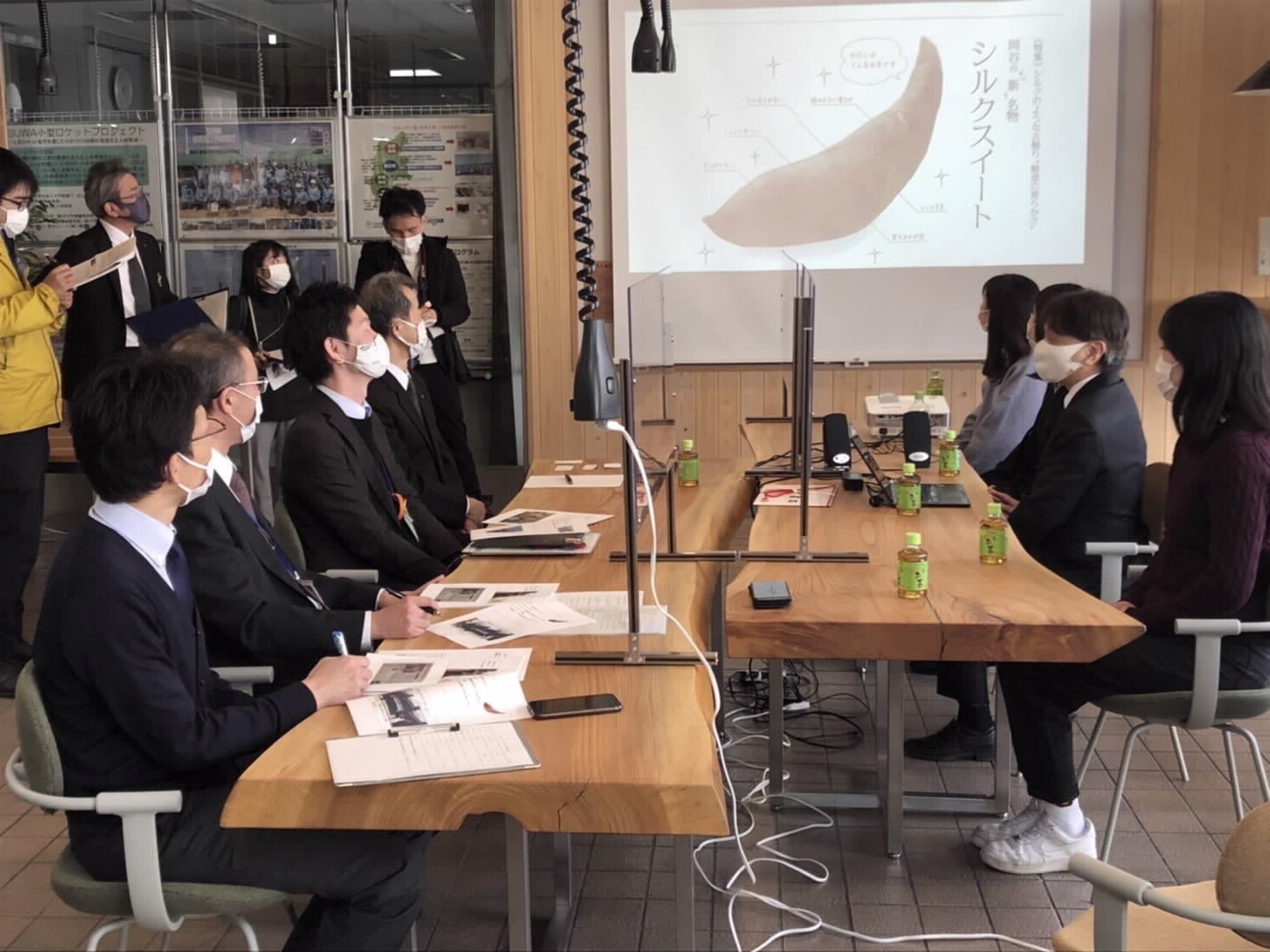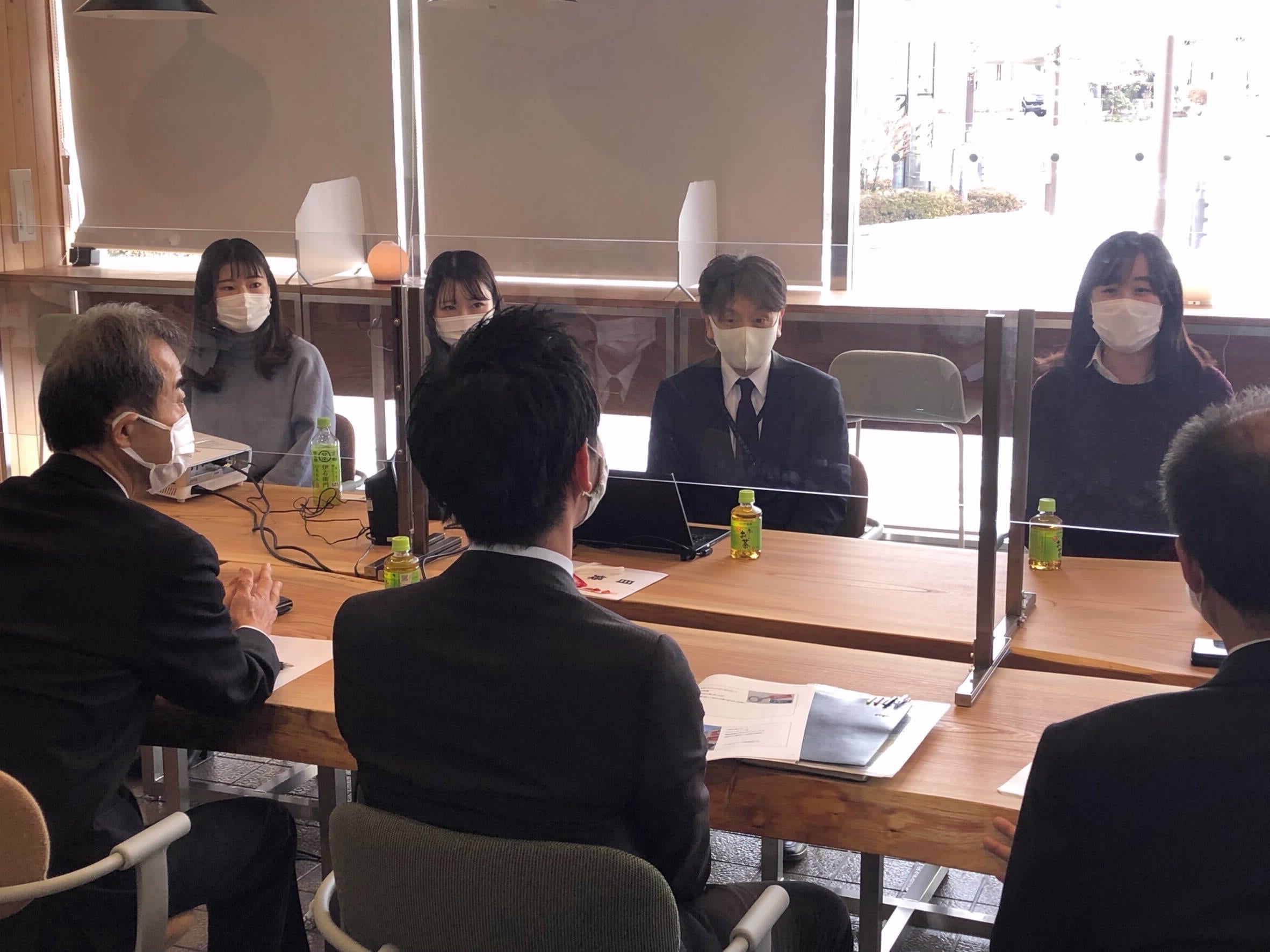贈呈式では、藤田康範教授と法学部3年山田莉奈さん、経済学部3年船井真優さん、渡利香音子さんから収益の一部10万円が寄贈されました。「岡谷市は今まで全く知らない土地でしたが、諏訪湖と山があって自然溢れる場所で充実した時間を過ごせました。ワーケーションで訪れたことがきっかけで地域発信のために何ができるかを東京で過ごしていても日常的に考えるようになりました。」と山田さん。お世話になった岡谷市の「ワーケーション」活動に貢献したいという学生たちの思いに、今井竜五市長は「貴重な収益を大切に使わせていただきます。みなさんのように地域のために活動してくださる学生をこれからも応援していきたいと思います。また、岡谷には色々な素材があるので、これからも交流を深め、生かしていただきたいです。」と感謝の言葉を述べました。学生たちは岡谷市が力を入れて栽培しているサツマイモ「シルクスイート」を活用したクレープのアイデアも提案し、引き続き、地域貢献につながる活動を行っていきたいと語りました。