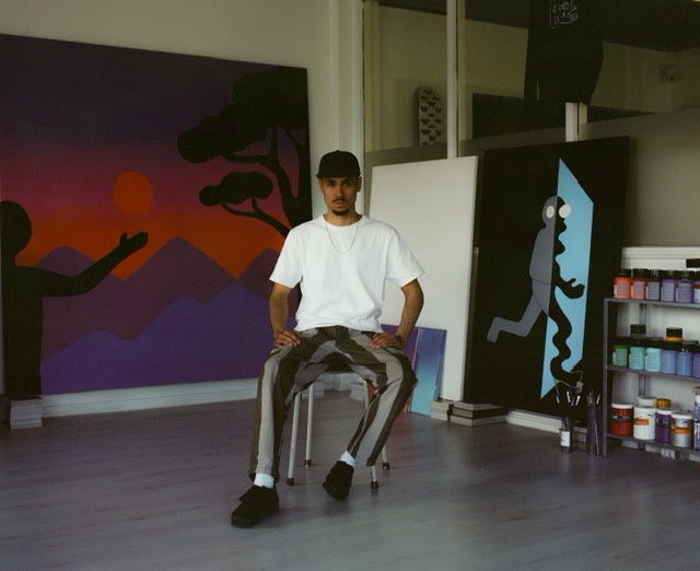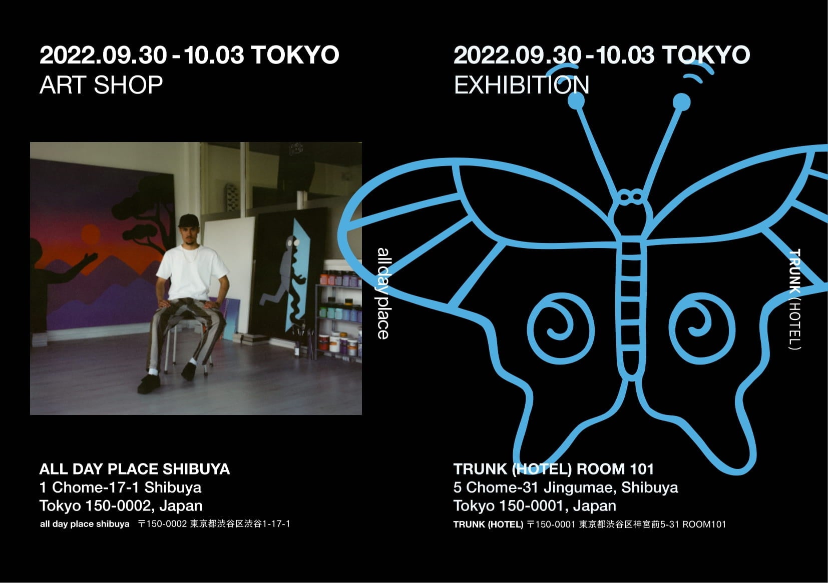 TRUNK(HOTEL)では絵画や大型作品を中心に展示し、all day placeではTシャツ、ポスター、8月にローンチしたばかりのスケートボードブランドBlaauw!も販売いたします。