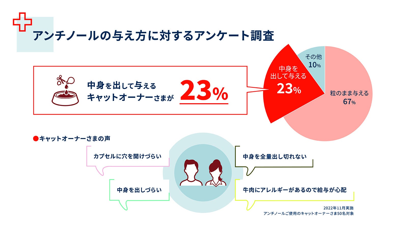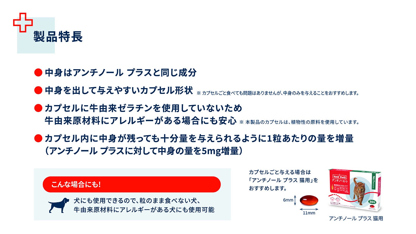 「アンチノール プラス 簡単カプセル 猫用」は、『アンチノール® プラス』をもっと簡単に中身を出して与えたいというキャットオーナーさまの声にお応えして開発した新商品です。