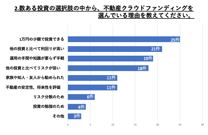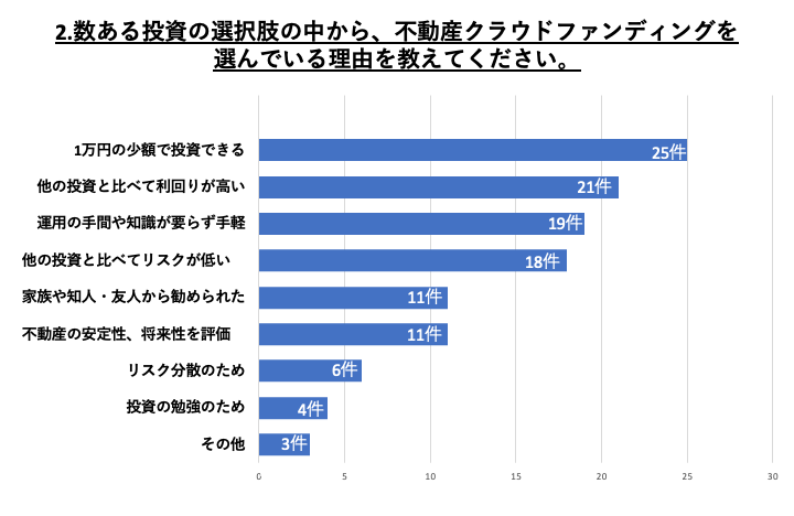 数ある投資の選択肢の中から不動産クラウドファンティングを選んでいる理由を聞いてみたところ1位が「1万円の少額で投資できる(25件)」でした。2位が「他の投資と比べて利回りが高い(21件)」、3位が「運用の手間や知識が要らず手軽(19件)」、4位が「他の投資と比べてリスクが低い(18件)」、同率5位が「家族や知人・友人から勧められた(11件)」「不動産の安定性、将来性を評価(11件)」、7位が「リスク分散のため(6件)」、8位が「投資の勉強のため(4件)」でした。