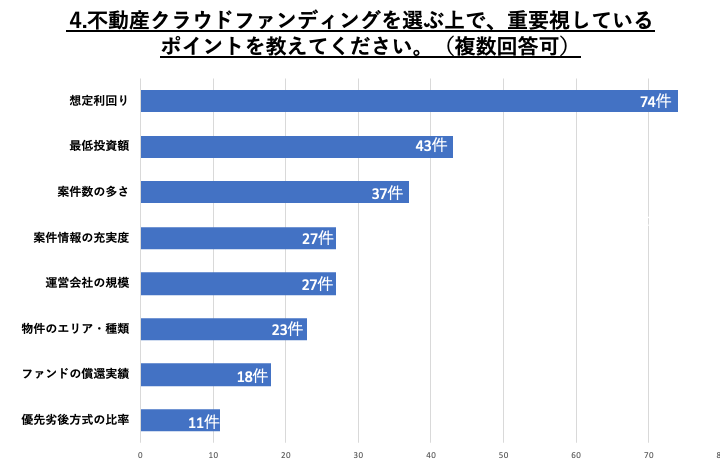 圧倒的多かったのが「想定利回り(74件)」でした。次いで「最低投資額(43件)」、「案件数の多さ(37件)」、「案件情報の充実度(27件)」、「運営会社の規模(27件)」、「物件のエリア・種類(23件)」、「ファンドの償還実績(18件)」、「優先劣後方式の比率(11件)」といった回答になりました。