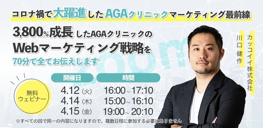 QOOSO PLAN株式会社・カッコイイ株式会社の代表を務める川口 健作は、2022年4月にAGAクリニックのためのウェビナー、「コロナ禍で大躍進したAGAクリニックマーケティング最前線」を開催いたします。