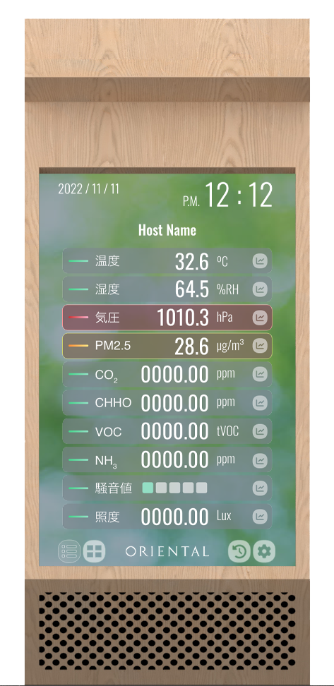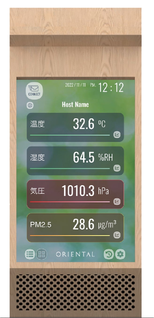 温度、湿度、CO2、PM2.5、tVOCを高精度にモニタリングすることが可能です。また、一般的なモニタリングデバイスは小型で別の管理画面などでしか数値がわからないものが多くありますが、本システムは内蔵のモニターで数値をリアルタイムに表示します。