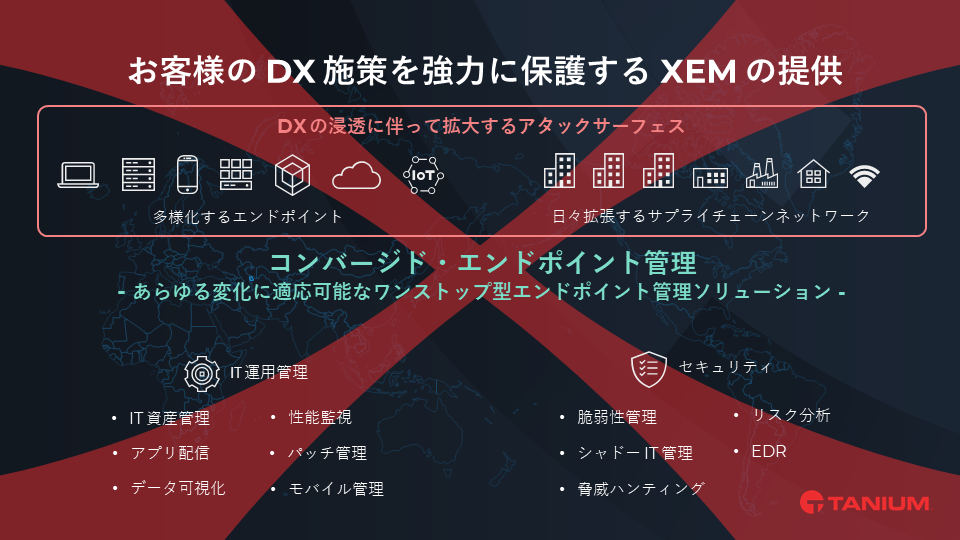 XEMのインスピレーションとなったタニウムの統合プラットフォームは、可視性、制御、信頼を最適化するように設計されており、新しいカテゴリーと統合アプローチを採用するタニウムのクラウドおよびオンプレミスの顧客の重要なユースケースをサポートします。
