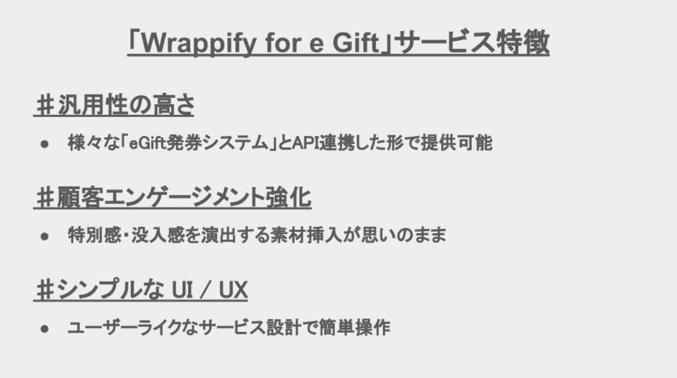 「Wrappify for e Gift」は「Wrappify」が提供する機能のうち、eギフトに特化したサービスです。これからeギフト領域に参入する事業者様および既存のeギフトサービスの提供価値をデジタルメッセージカードからも高めたいとお考えの事業者様向けに展開しております。