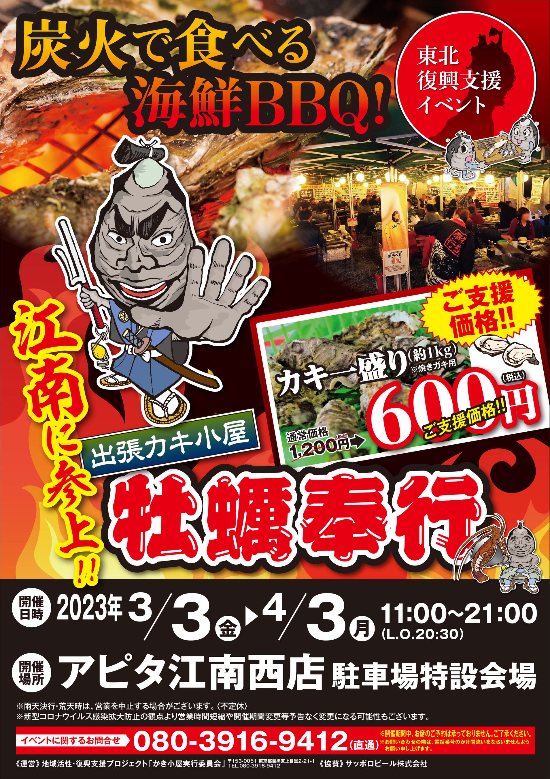 「愛知江南市で牡蠣小屋」出張かき小屋が江南に出店「地域活性・東北復興支援プロジェクト 出張カキ小屋 牡蠣奉行」がアピタ江南西店 で短期出店(3/3-4/3)