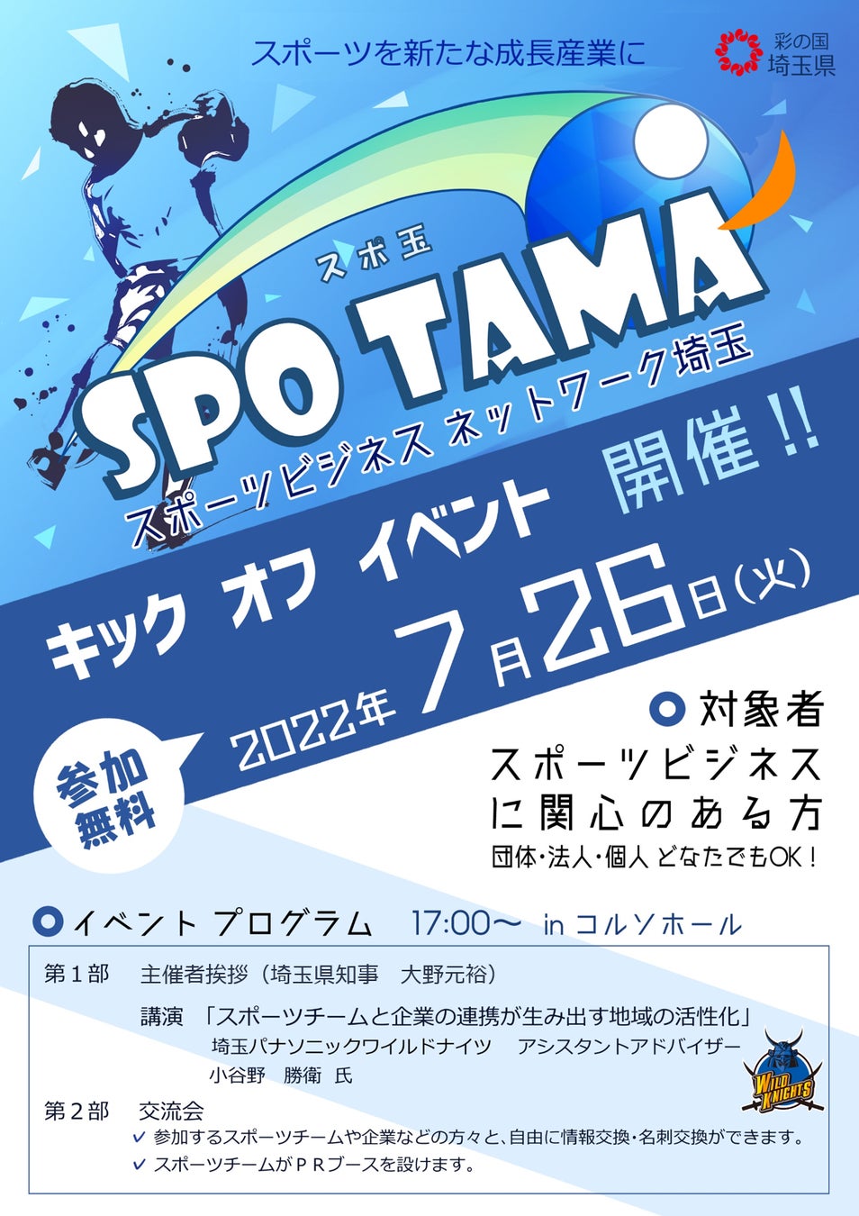 また、「スポーツビジネスネットワーク埼玉」の立上げを広く周知するために、キックオフイベントを開催します。