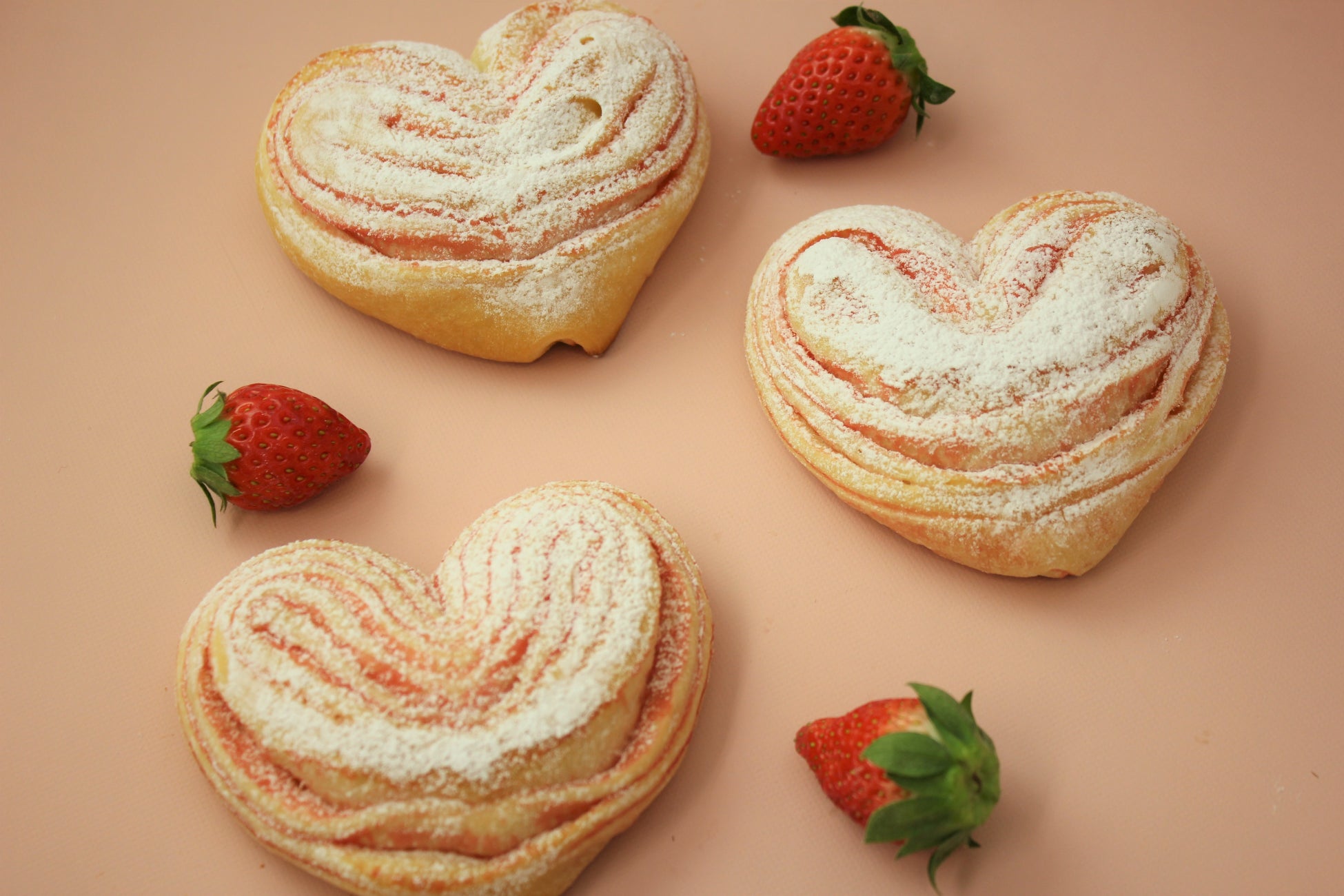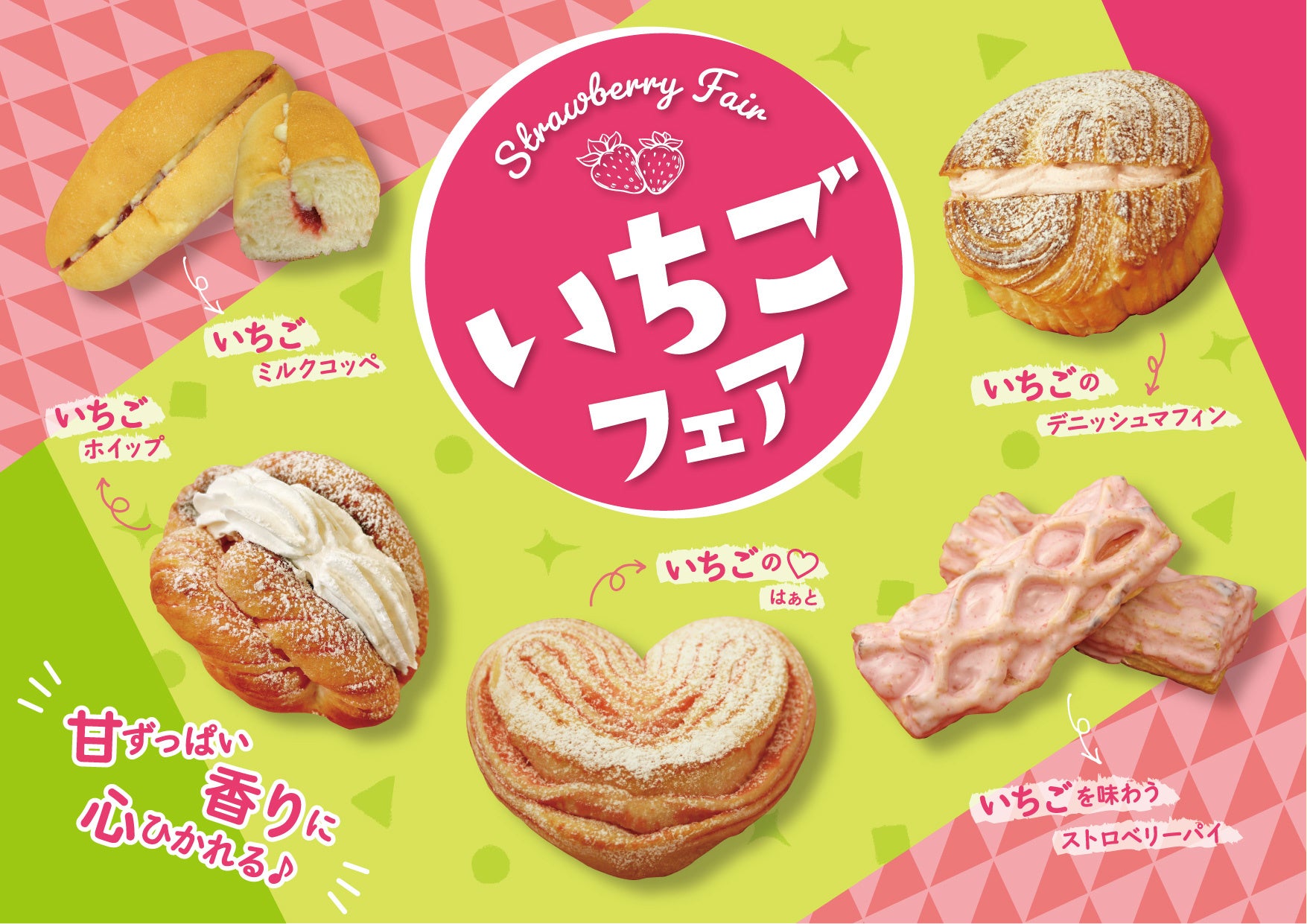 可愛らしいハートの形の菓子パンや、いちごチョコたっぷりのパイ、いちごホイップを挟んだデニッシュなど、新年からワクワクするような いちご尽くしのフェアがスタートです。この季節だけの味わいを、ぜひお楽しみください。