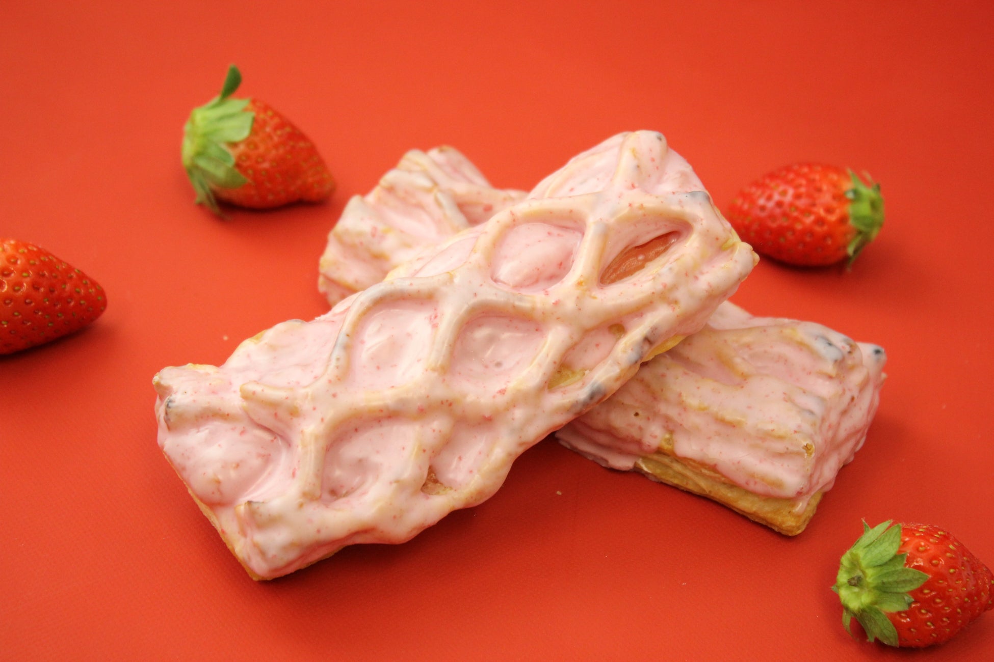 ストロベリークリームを挟んでサックリと焼き上げたパイに、いちごのチョコをたっぷりとコーティング。
