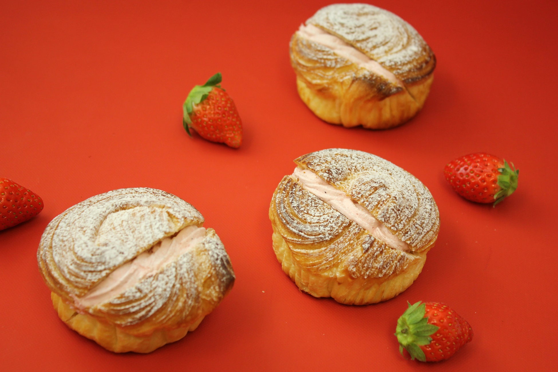 国産とちおとめ苺の濃縮果汁入りいちごクリームを折り込んで焼き上げました。