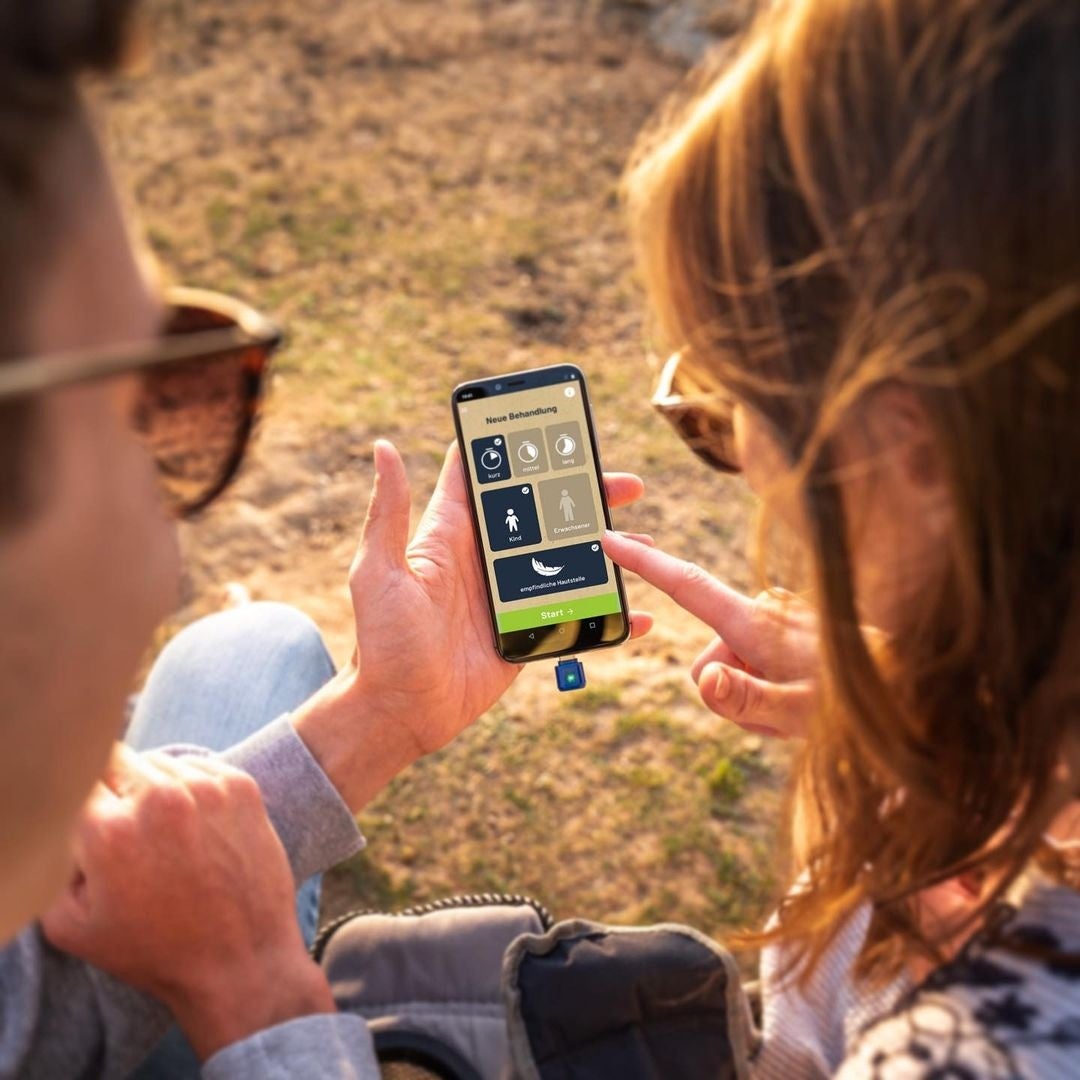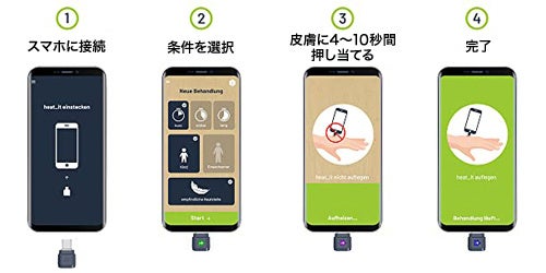 スマホにUSBデバイスを差し込み、アプリを使用して皮膚に4〜10秒間当てるだけでOK。従来の化学物質を含む薬品は不要。