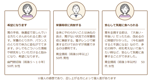 132名の胃がんにより胃を切除された方を対象に試食モニターを実施したところ、「消化の良さ」「やわらかさ」「準備の簡便性」について高い評価をいただきました。また、食事制限の必要のない方からも、「ふだん食べている食事以上の味・品目・栄養なのに、消化しやすい」などの声をいただいており、「ちょっと胃腸の調子が悪いとき」などにもご利用いただけます。