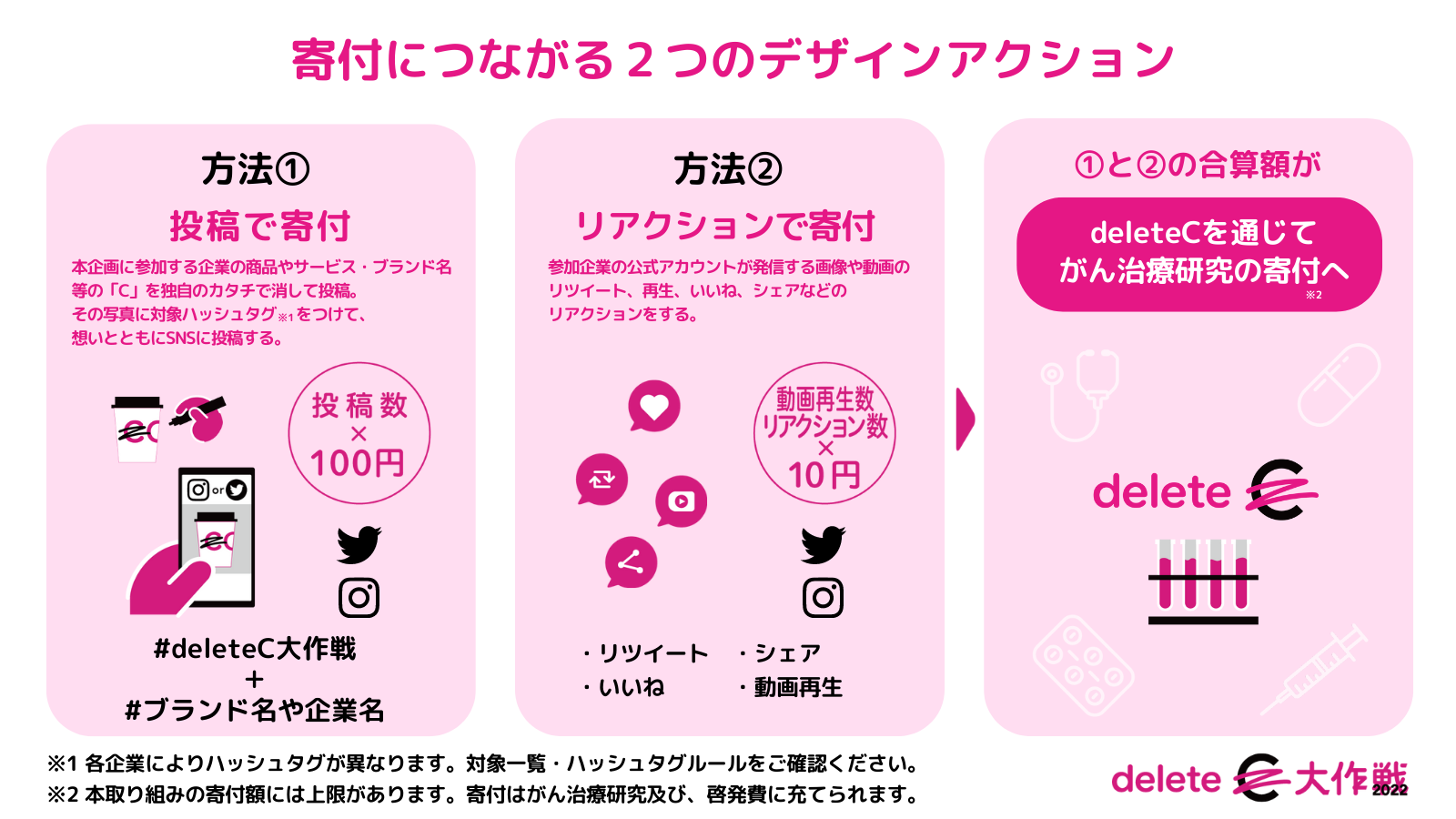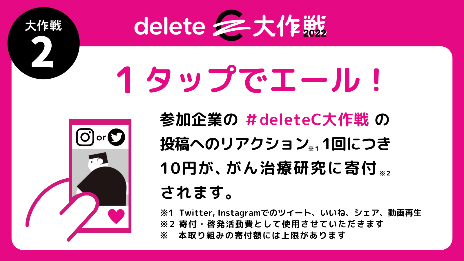 「#deleteC大作戦」は、参加企業の商品パッケージやロゴから、「Cancer(がん)」の頭文字でもある「C」を消した画像や動画をSNSへ投稿することにより100円が、がん治療研究への寄付に繋がるソーシャルアクションです。また、参加企業の公式アカウントが発信する画像や動画に反応(いいね、動画再生、シェア、リツイート)すると、1反応あたり10円が、がん治療研究へ寄付されます。
