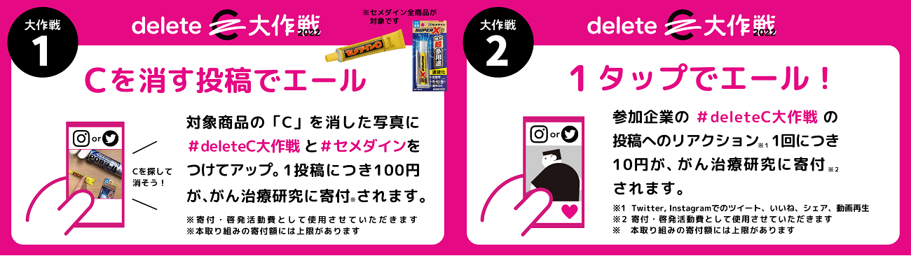 セメダイン商品のパッケージにある「C」を消した画像や動画に「#deleteC大作戦」と「#セメダイン」をつけて、対象SNS(Twitter・Instagram)に投稿すると100円、セメダインの公式アカウントから発信される「#deleteC大作戦」がついた投稿を「いいね」「動画再生」「シェア」「リツイート」すると10円が、がんの治療研究へ寄付されます。