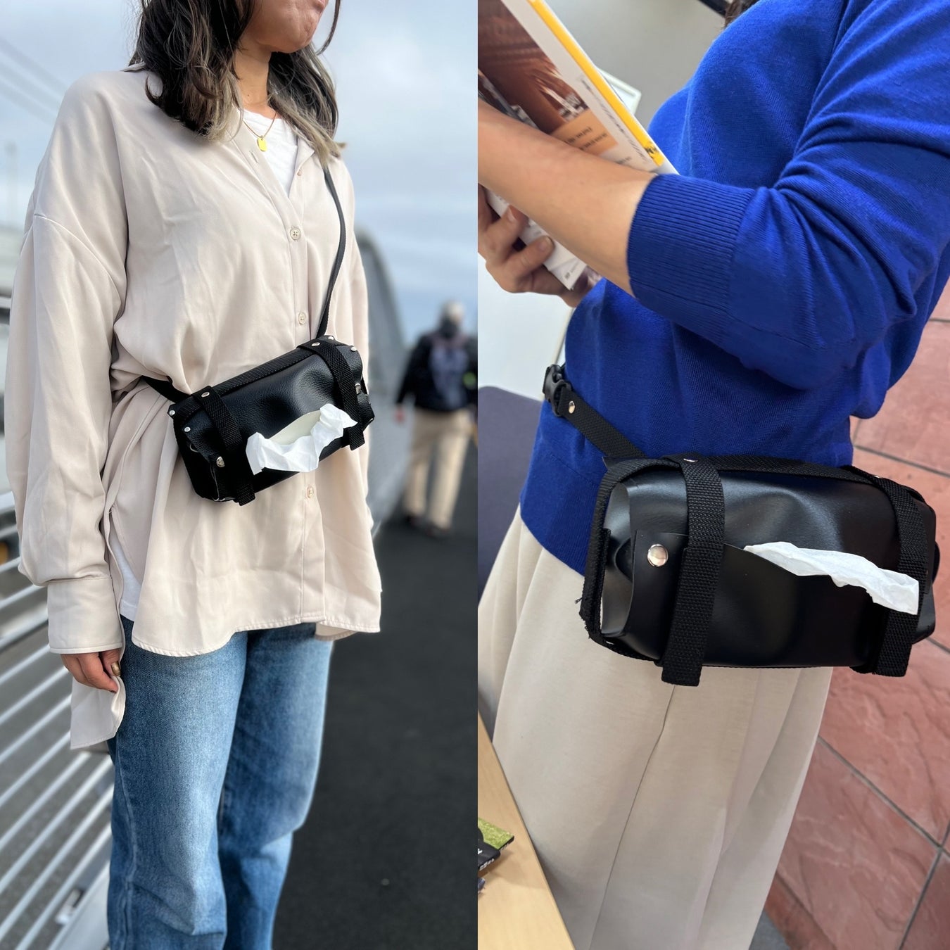 どこに持ち歩いても、いつもティッシュをそばに置いておけます。