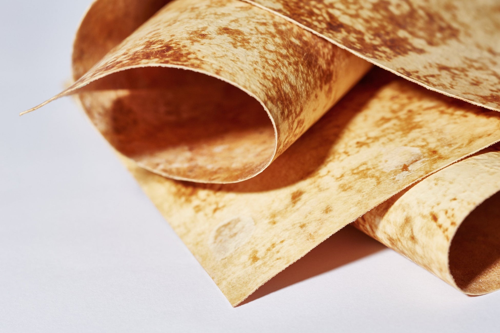 表革は、薄く重ねられたキノコの菌糸体から生まれた植物由来のマッシュルームレザー。