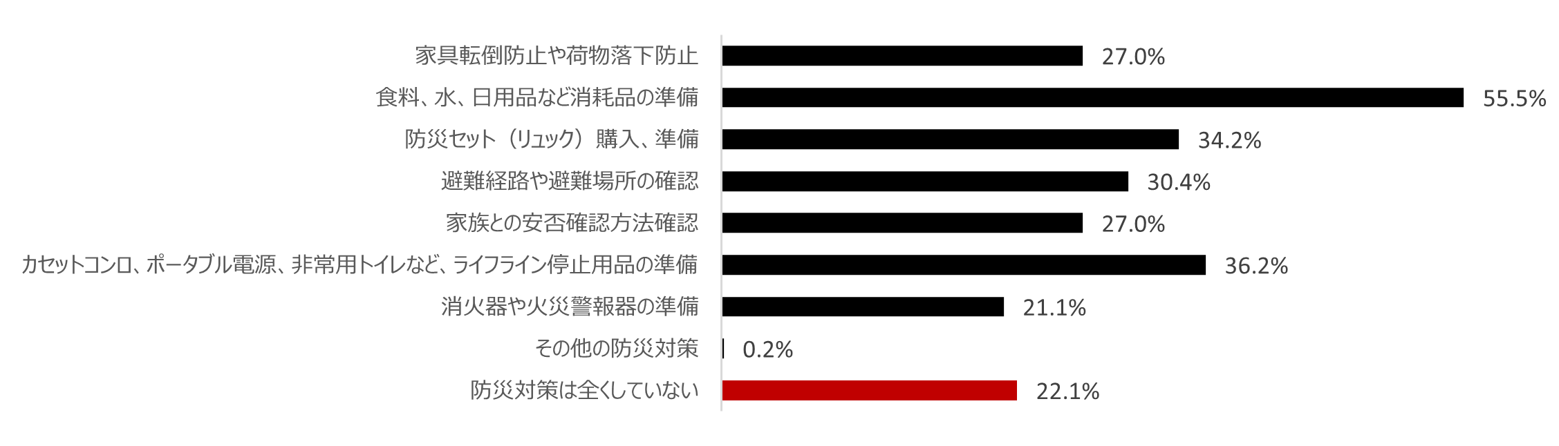 防災対策を全くしていない人は22.1%で、約8割(77.9%)の人は何かしら対策を講じています。防災対策は災害時の行動シミュレーションをしてこそ具体的な対策が見えてくるものですが、実際にはほとんどされていないようです。「買っておわり」「準備しておわり」とならないよう、家族や友人と話し合い、最適な防災対策を講じることが重要です。