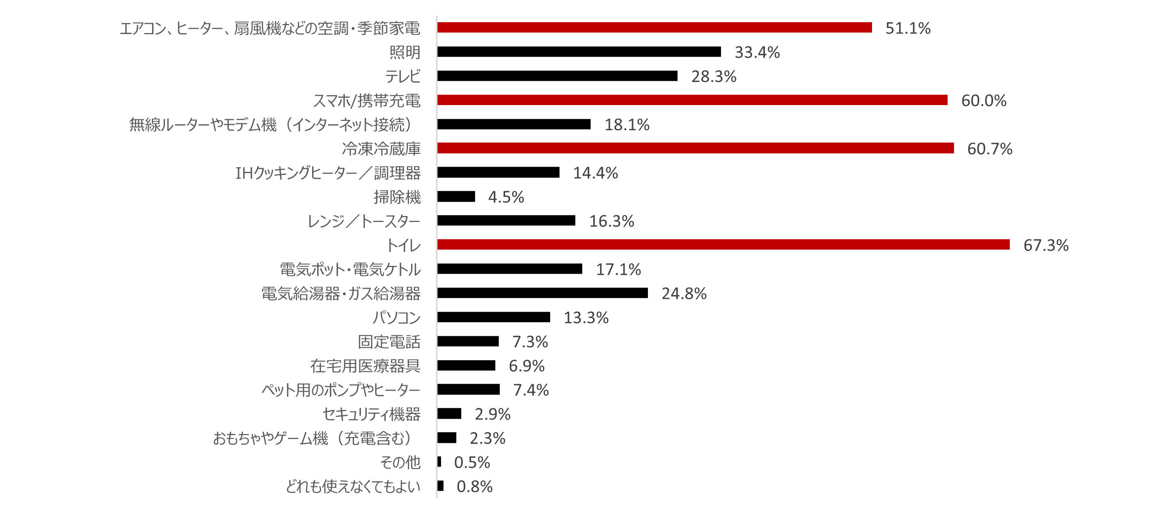 - 停電時使える状態にしておきたいのは、消費電力の大きい「冷凍冷蔵庫」「空調・季節家電」