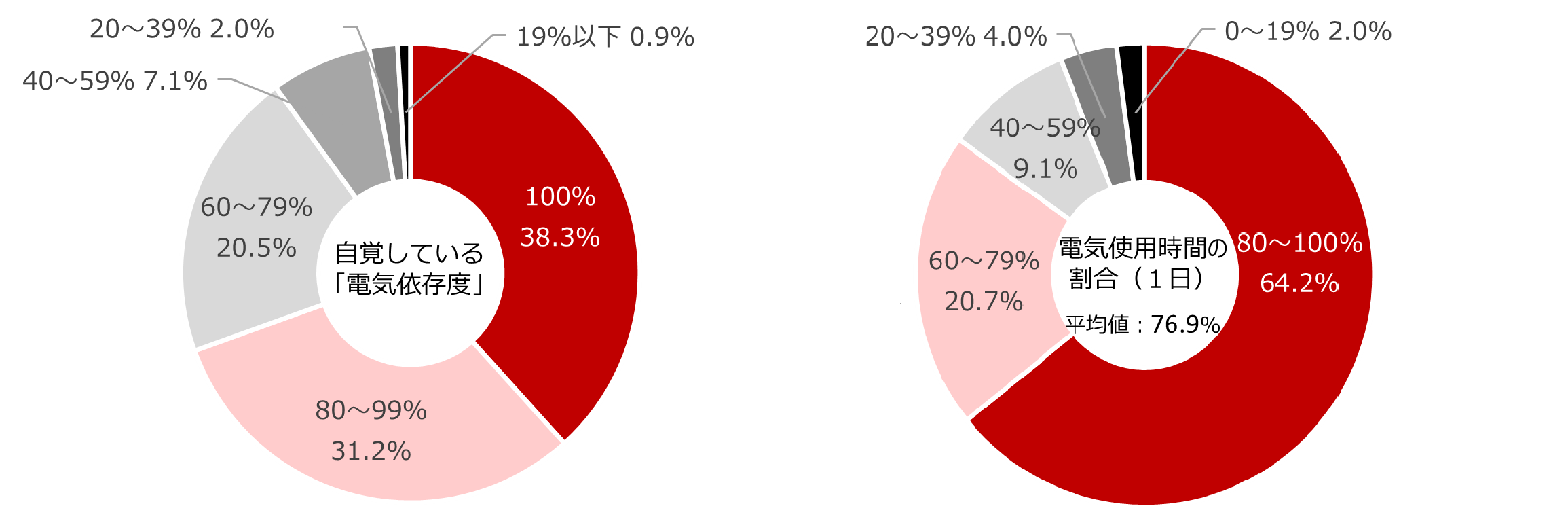 - 「電気依存度100%」を自覚しているのは約4割(38.3%)、80%以上も含めると約7割(69.5%)
