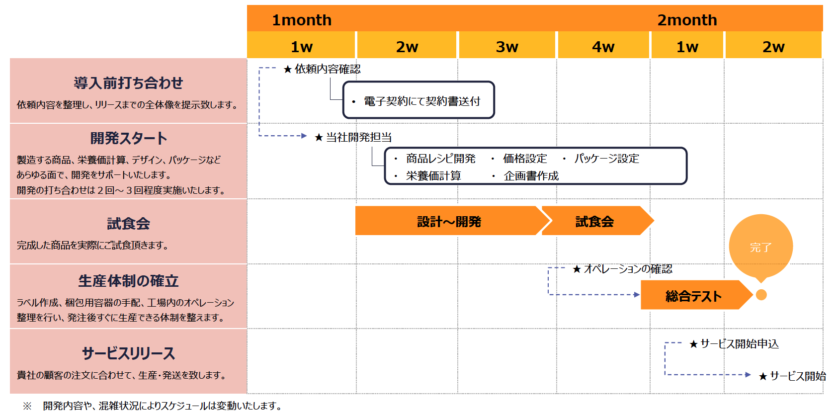クライアントのオリジナル商品・ブランド開発の企画から販促までの支援や、飲食店様の商品製造過程の一部外部発注、食材・料理工程の指定を含めたフルオーダーを、低コストかつ在庫リスクなしで始められる事から、ご好評を頂いています。