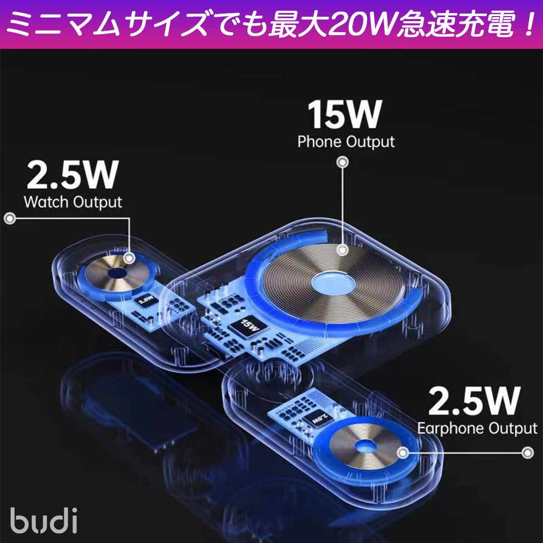 極小!軽量!簡単便利!このサイズ感でスマホ、アップルウォッチ、ワイヤレスイヤホンの3台同時急速充電が可能、MagSafeにも対応した充電器の傑作!budi「20Wミニマムワイヤレス充電器」新登場です!