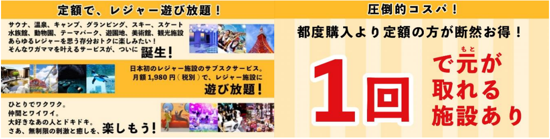本サービスでは、遊園地・テーマパーク・水族館・動物園・美術館・温泉・サウナ・キャンプ場・グランピング・観光施設など様々なジャンルのレジャー施設が「レジャパス!」という1つのプラットフォーム上で入場枠を開放いたします。平日プランは月額1,980円、土日祝含むプランで月額2,980円と、入場チケットを都度購入するよりお得に利用いただけます。1ヶ月間1度も利用がない場合は、翌月に「レジャコイン」が付与され、友達や家族を誘える権利に変換され、翌月以降に誰かを誘って遊びに行けることも大きなポイントです。