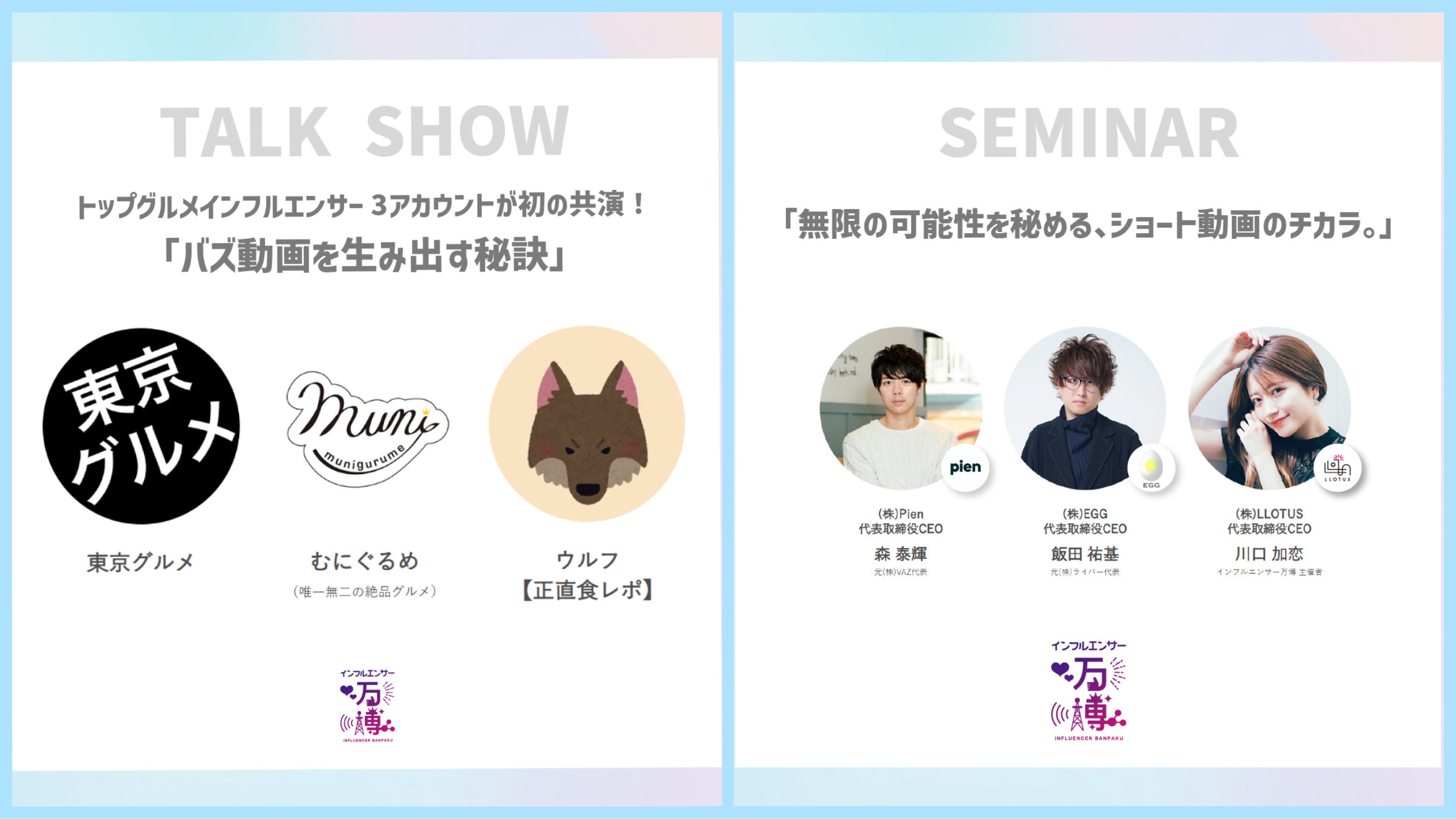 トップグルメインフルエンサー「東京グルメ」「むにぐるめ(唯一無二の絶品グルメ)」「ウルフ【正直食レポ】」「当イベント主催者 株式会社LLOTUS 代表取締役CEO 川口加恋」の4名が登壇します。