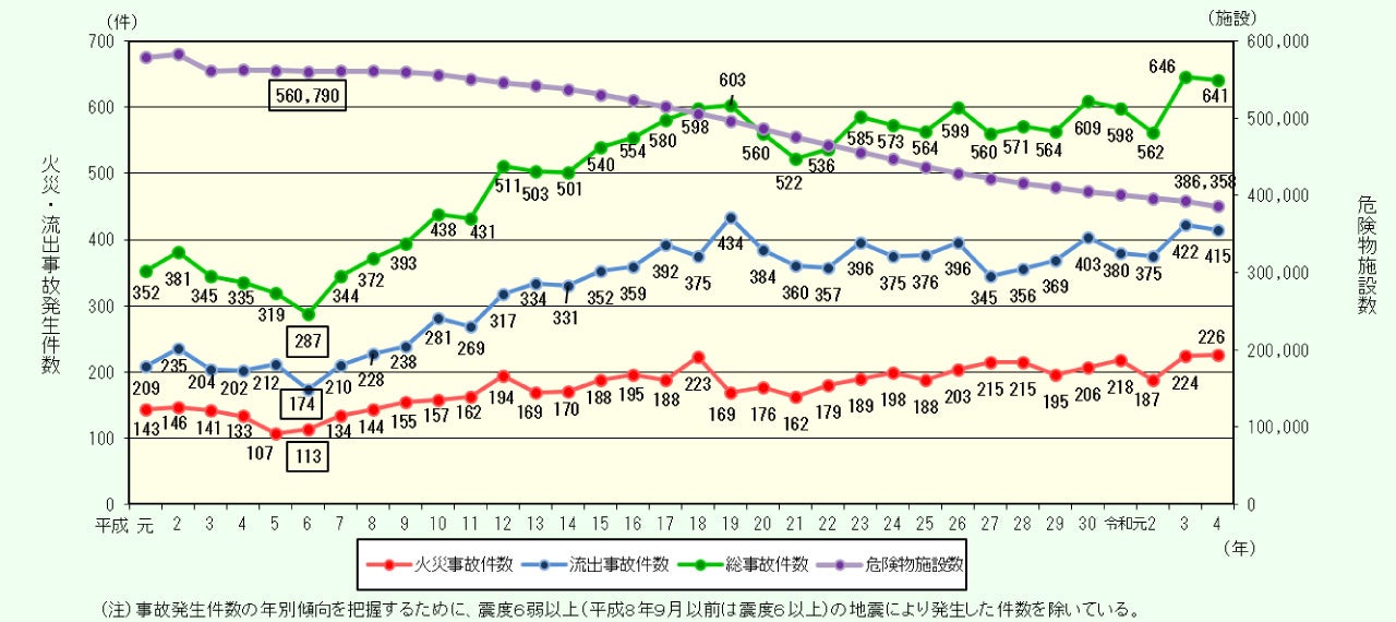 危険物施設における火災事故・流出事故の発生件数及び危険物施設数の推移