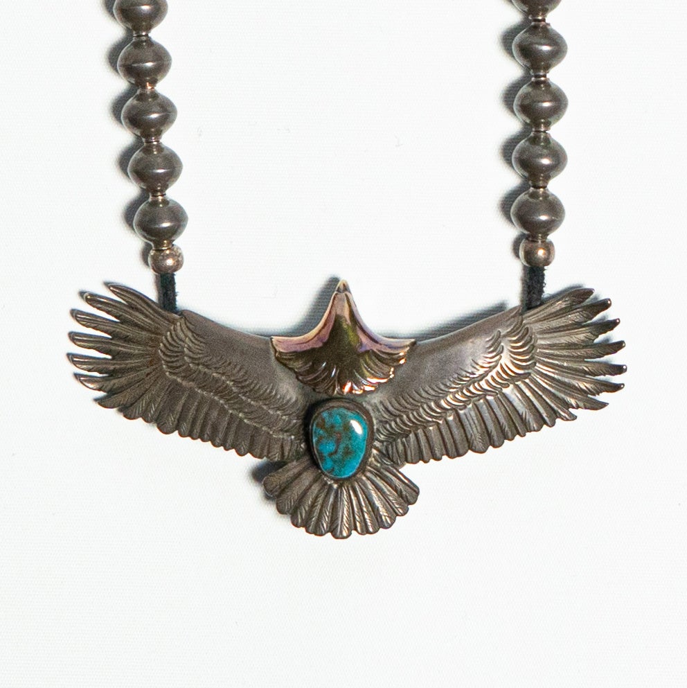 ゴローズの大イーグルの中でも最高峰とされるこちらのアイテム。背中にターコイズがロウ付けされているだけでなく、年号、ネーム、スタンプ2羽、目彫りなども施されているのが特徴。また、"玉付き"と呼ばれイーグルの口の中に玉が入っている状態であることも特筆すべき点です。これは口の大きさを均等にする為と思われる玉が、本来は最後に取り除かれるところを残ったまま世に出てしまった珍しいアイテムとなっております。