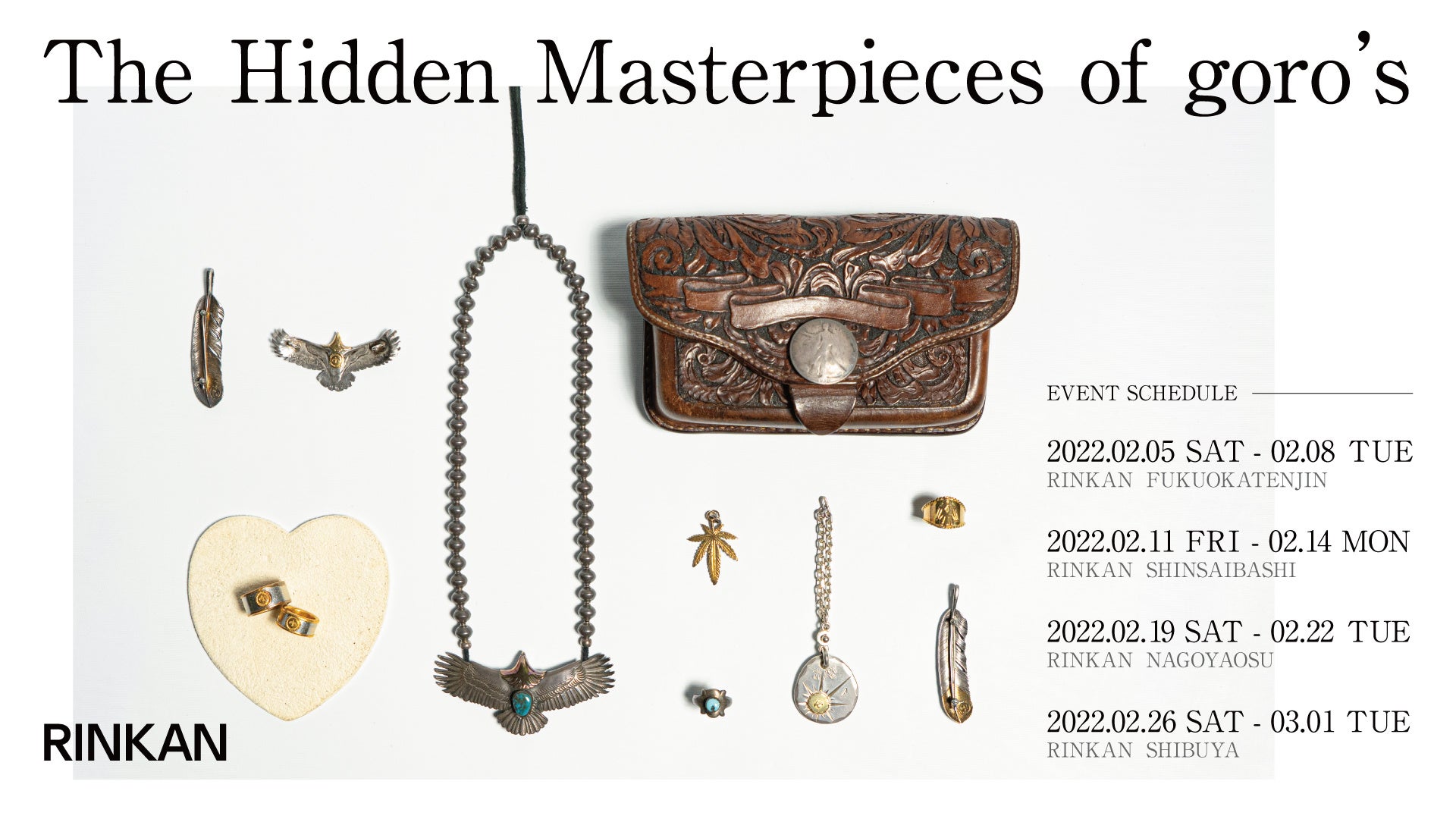 ストリートブランドやデザイナーズブランドの買取・販売を行うセレクトショップ「RINKAN」は、2022年2月5日(土)から3月1日(火)の期間、ゴローズの特注品やレアアイテムが一堂に会するゴローズの祭典「The Hidden Masterpieces of goro’s」を福岡、大阪、名古屋、東京の4つの都市で順次開催いたします。本イベントでは、特に貴重な大イーグルの中でも最高峰と言われる「カタロニア大イーグル」や現在ではオーダーを受け付けていない24kのゴールドとプラチナで作られている「マリッジリング」、goro’sの創立者である高橋吾郎氏の結婚式の引き出物として招待客にのみ配られたキーホルダー「HAPPY LIFE」などを含むレアアイテムと、それらとの違いを楽しめるようにゴローズの定番アイテム合わせて約100点が集結し、展示や販売を行っております。