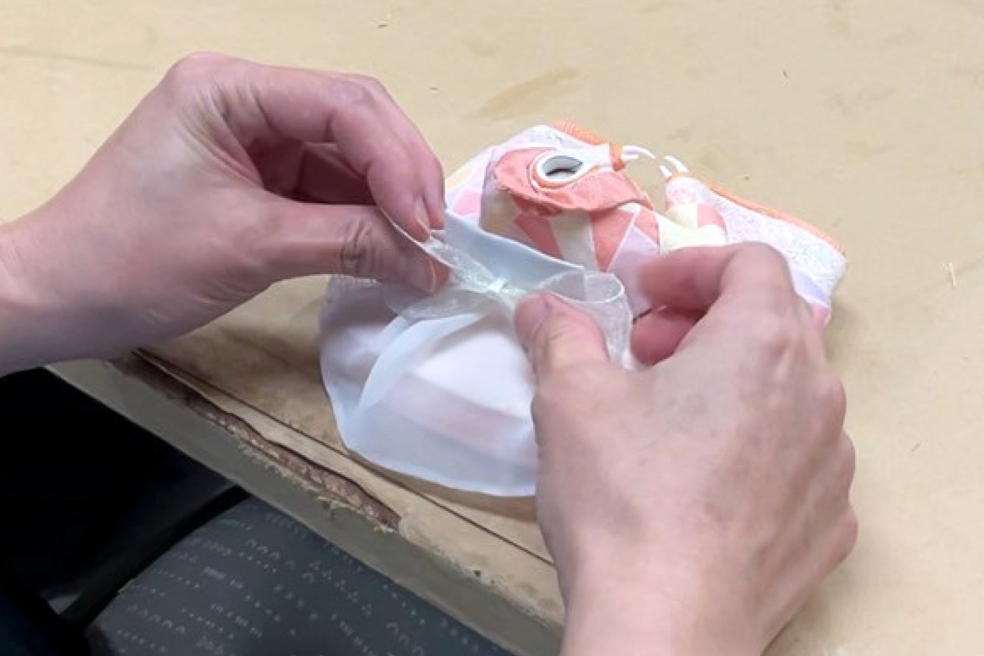 丸い曲線の親しみやすい柔らかなフォルムや背中のリボンなど、伝統の中にモダンな要素を取り入れ、永く愛される優しい雰囲気の雛人形が完成しました。