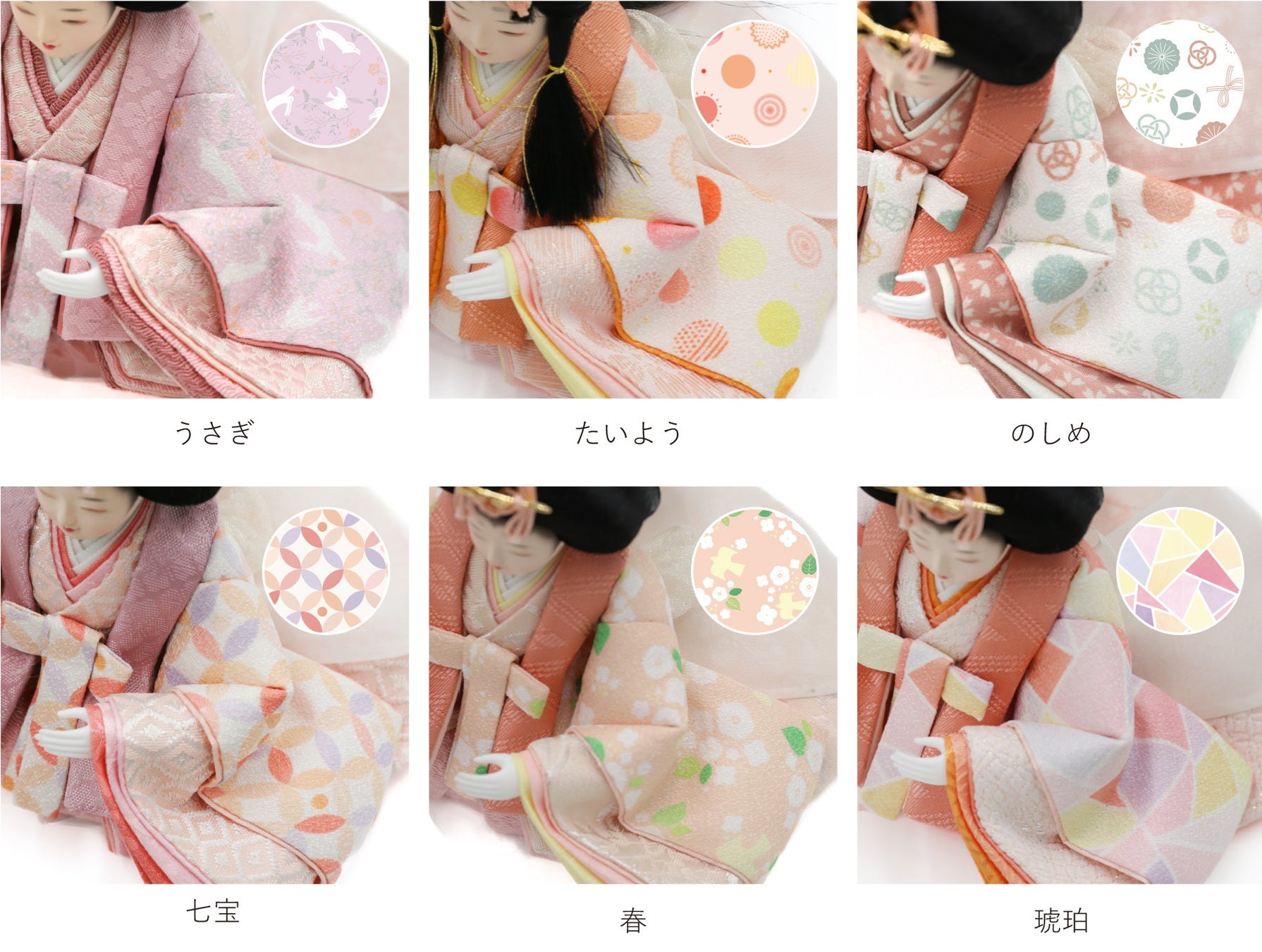 『花ころも』では、6種類の個性豊かなオリジナルデザインを作成。それぞれの衣装に合わせた台屏風や作札もセットの柄で作成しました。鯉のぼりで培った色彩美と細部へのこだわりが、ひな祭りを一層華やかに演出します。