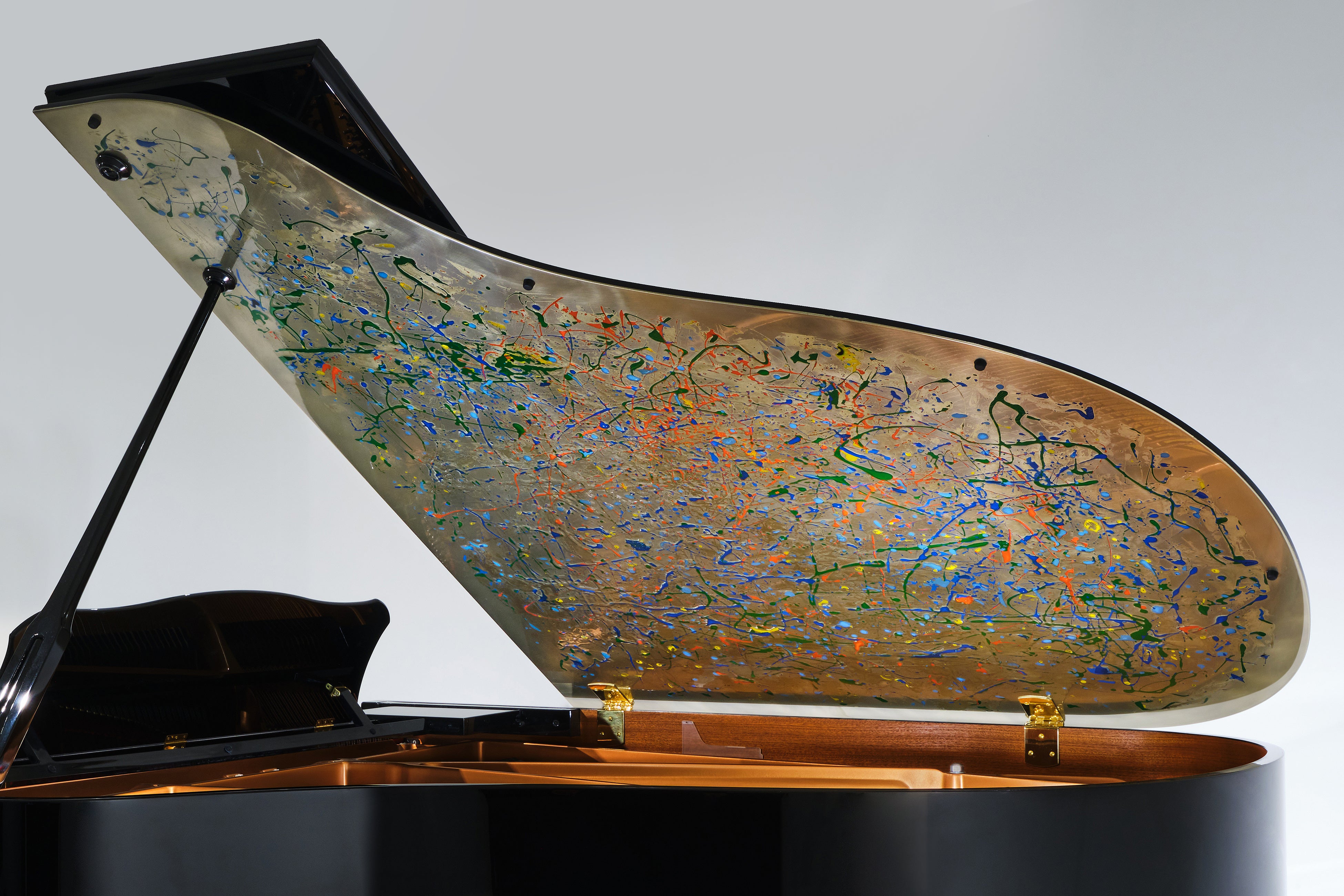 下記写真は、日本伝統の漆工芸家 浅井啓介氏がデザインを手掛けた木の樹液である漆を用いてアクションペイント的な漆ドリッピング技法「堆(つい)」。漆が完全に硬化した後に、特殊メタルコーティングVeroMetal🄬を塗布/乾燥/研磨。まさに、匠の技が織りなす唯一無二のグランドピアノ「Sanctuary」