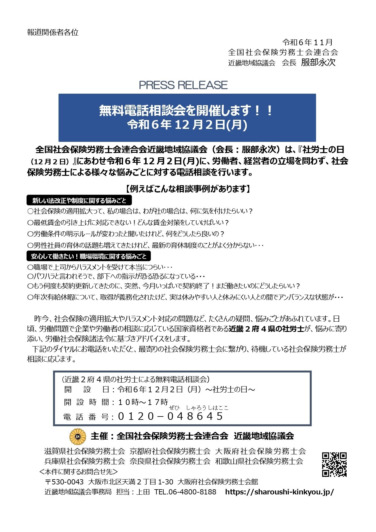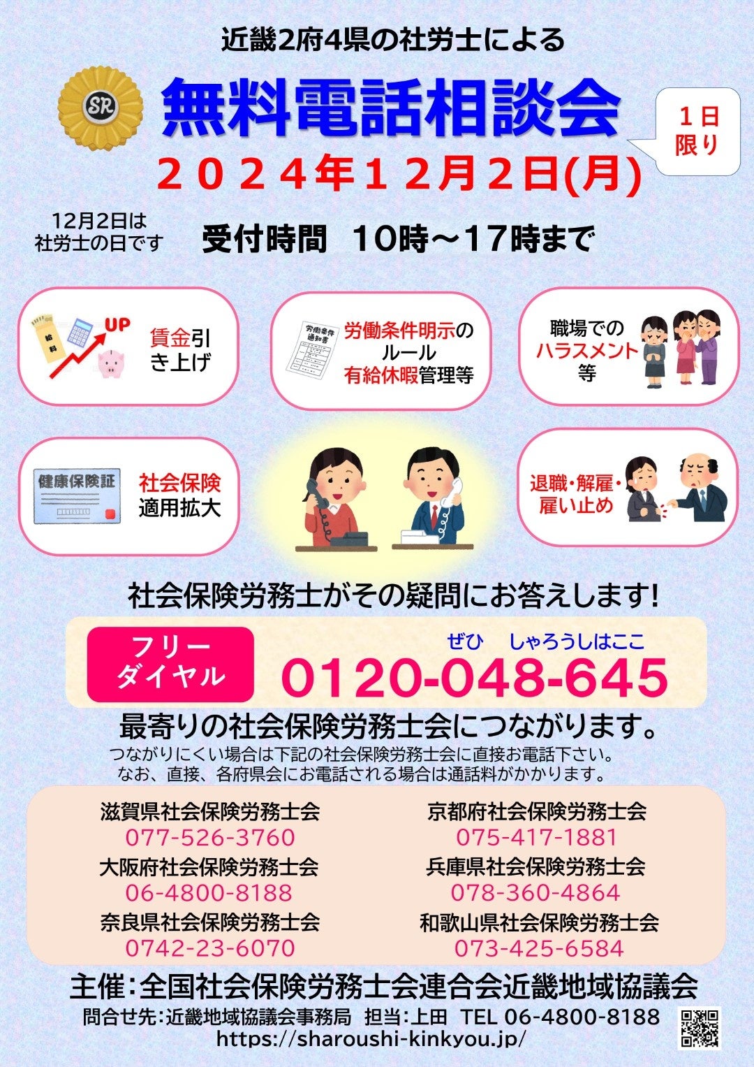 年収の壁も、年金も、職場でのハラスメントも!社労士による労働や年金に関する無料電話相談会(12月2日)を近畿で開催!