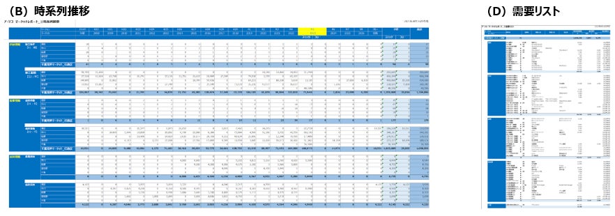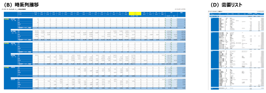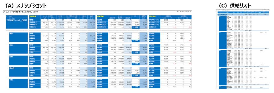 1本で最大5リージョンまで自分の定義で分析範囲エリアを指定が可能。例えば、千葉湾岸マーケットを調査する場合、浦安、市川、船橋、習志野、千葉といった構成エリアをリージョンで指定する。レポートは、リージョンを指定後ワンクリックで下記4シートがエクセルで自動生成され、ダウンロードが可能。