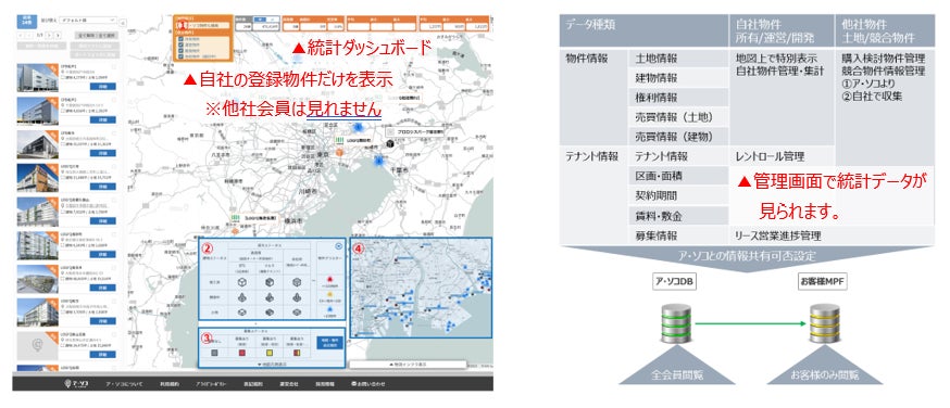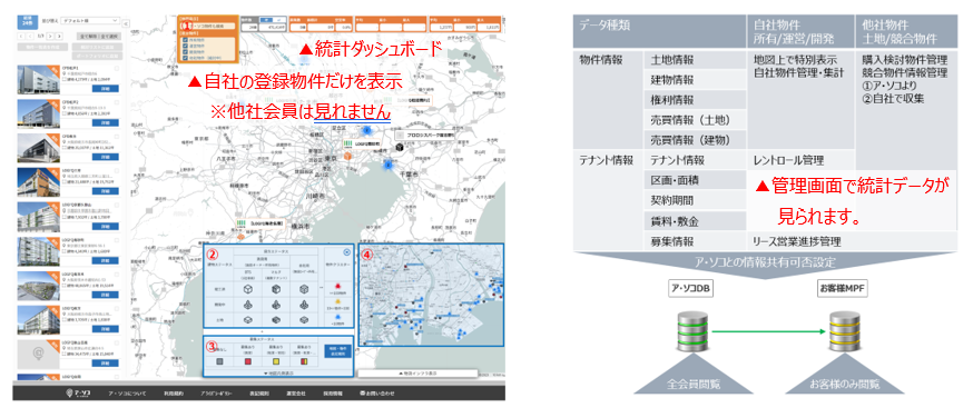 ア・ソコの地図・物件データベースの情報に加え、自社物件の地図表記、テナント情報の集計・管理(レントロール機能)、購入検討中の土地・建物情報、自社で収集したマーケット情報等、他社と共有できない情報をア・ソコから独立した自社専用のデータベースを構築する機能。従来、担当者が収集した情報をエクセルで管理しているケースが多く、情報の網羅性・鮮度・更新頻度・社内共有に課題を抱えており、それらの課題解決と守秘性確保という要望に応えたサービスとなっている。