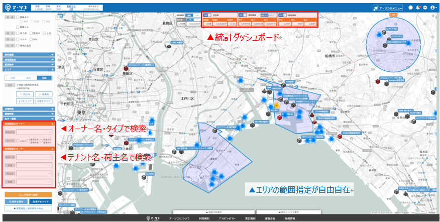 検索画面で、自分で指定するエリア、特定のオーナーが保有する物件、特定のテナントが入居する物件等の条件で検索し、該当する物件数と面積の合計に加え、空室率(募集中の物件数と面積)、賃料相場に平均時給相場まで表示される「統計ダッシュボード」の利用ができ、いつでもその場で簡易マーケット調査が可能。
