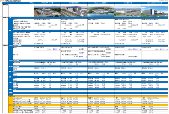 供給リスト:各リージョン20物件まで、物件名、竣工時期、床面積、空室率等のリスト