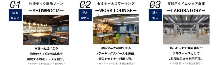 「TRC LODGE」は、「物流テック展示ゾーン」、出展企業限定の「セミナー&コワーキングスペース」・「実験用タイムシェア倉庫」の3 ゾーンから成る「物流テックを知る・学ぶ・試す・繋がる場」です。