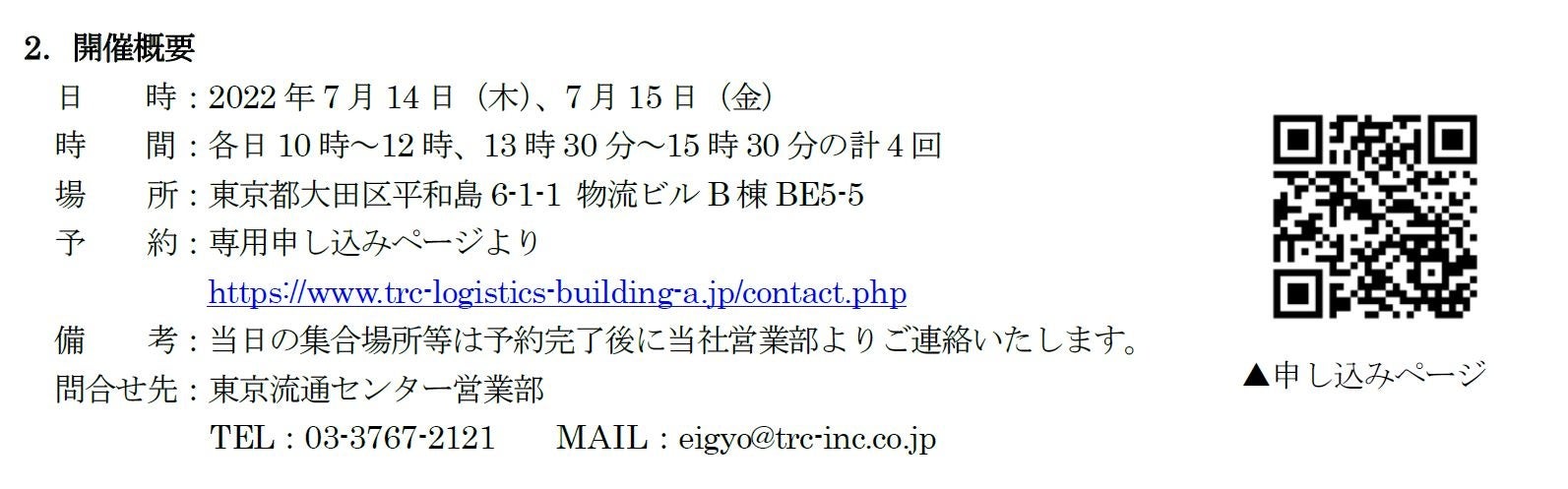 関連企業、メーカー・荷主企業、その他都心部で拠点構築を検討されている企業向けのモデルルーム内覧会を2022年7 月14 日(木)、15 日(金)に開催します。