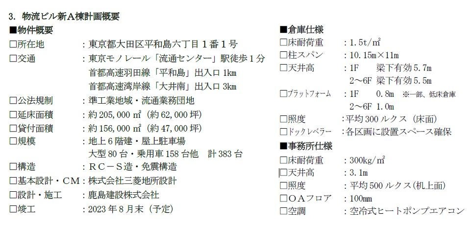 開発として、隣接する物流ビルA 棟を2021 年5 月末に閉館、2023 年夏の新棟竣工を目指しプロジェクトに