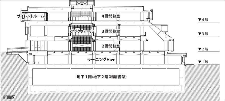 既存図書館の考え方を継承し、上階ほど静かで落ち着いたフロア構成を目指します。