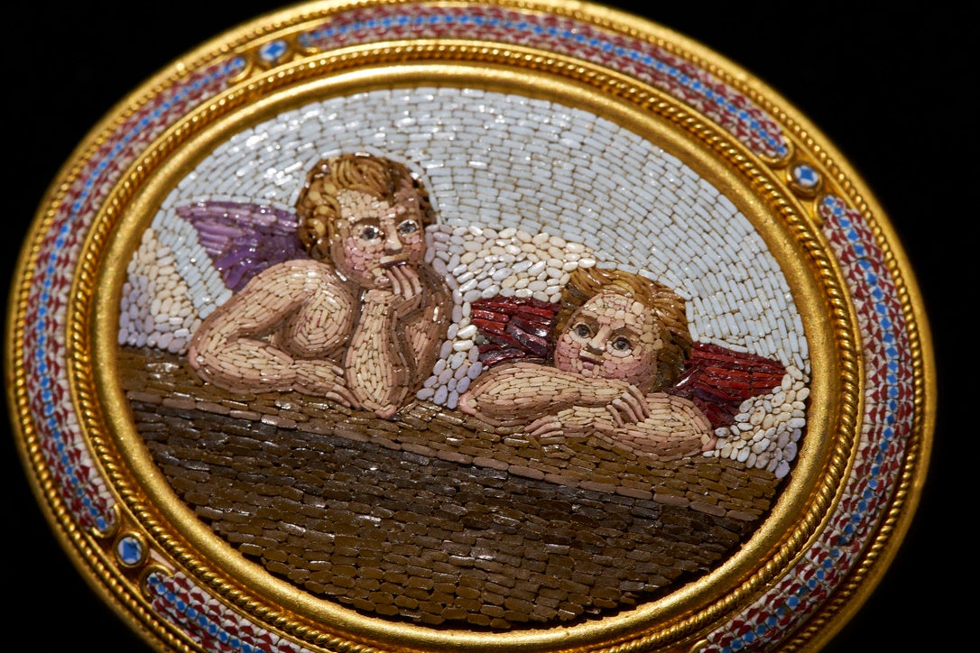 マイクロモザイクとは、17世紀にローマで栄え、バチカンが門外不出の技術として、19世紀に一度途絶えてしまったガラスの超絶技巧による工芸美術のこと。ローマ・バチカン博物館、イギリス・ビクトリア&アルバート博物館などには、当時の宗教的なモチーフのほか、水彩画のような緻密な風景や人物像、また、3D陰影と見まごう静物画のようなマイクロモザイクが展示されていますが、この本にも、博物館から抜け出したかのようなマイクロモザイクの数々が、美しい写真とともに惜しげもなく多数掲載されています。