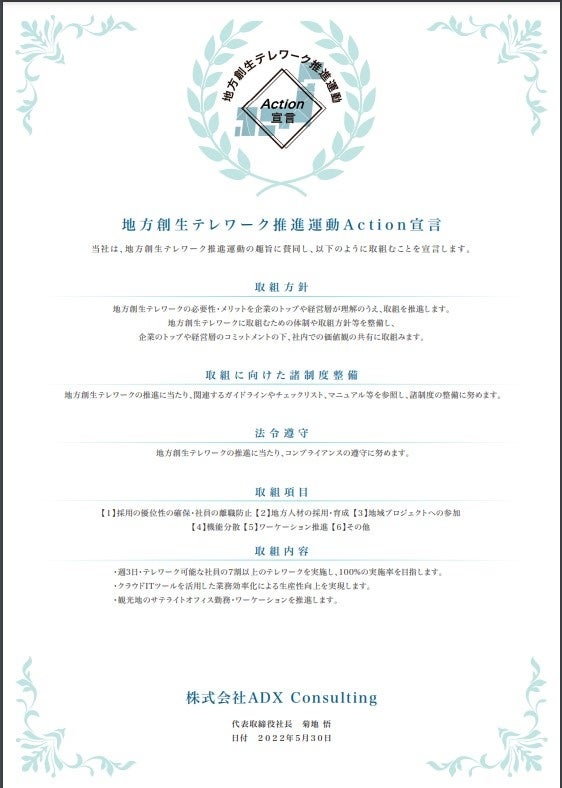 クラウドERP導入を柱とした「基幹系業務DXコンサルティング」を主力事業とする株式会社ADX Consulting (アデクスコンサルティング(https://adxc.co.jp/)、代表取締役社長:菊地 悟、本社:東京都中央区、以下 ADX)は、このたび内閣府・内閣官房が推進する「地方創生テレワーク推進運動」の趣旨に賛同し、推進運動に参加する為「Action宣言」を行いました。当該宣言が本日内閣府・内閣官房に正式に受理され、「地方創生テレワーク」事業のホームページに掲載されましたのでお知らせします。