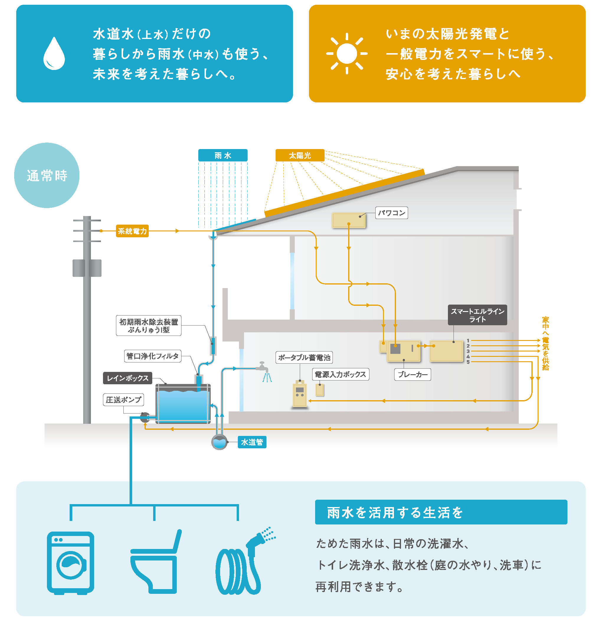⇒ 「雨水から水を、太陽光から電気を作り、化石燃料に頼らない暮らしを実現する」という先進的な住環境を表現しています。