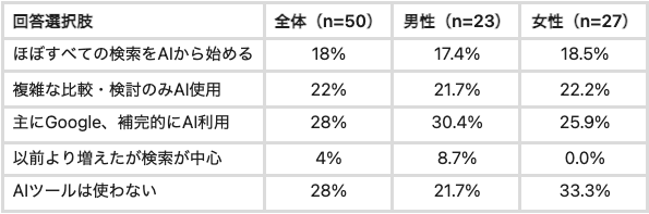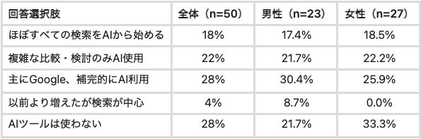 「ほぼすべての検索をAIから始める」層(18%)+「複雑な比較のみAI使用」層(22%)+「Google主体でも補完的にAIを使う」層(28%)を合計すると、AI活用層は72%に達します。AIを一切使わない層は28%にとどまり、「Googleだけに最適化すれば十分」という前提は、主要ターゲット層の3人に2人以上を見落とすリスクをはらんでいます。