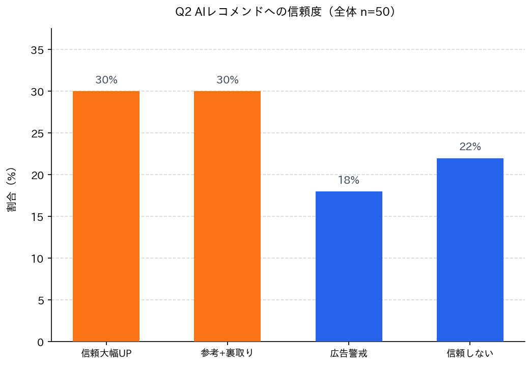 Q2:AIレコメンドへの信頼度|利用深度で9倍の差、88.9%の大幅上昇から71.4%の完全不信へ