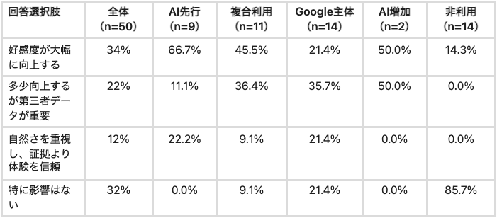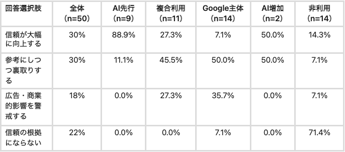 AI先行層の88.9%が「信頼が大幅に向上する」と回答する一方、非利用層では71.4%が「信頼の根拠にならない」と回答。AIによるブランド推薦の効果はターゲットのAI利用習慣に完全に依存しており、同じ施策の信頼効果に9倍の差が生じます。