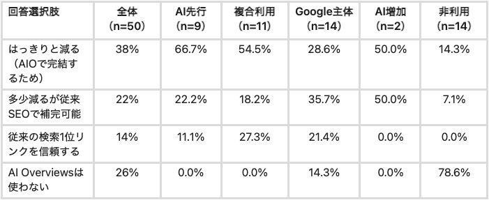 設問文:「Google検索の上部に表示される"AI Overviews"に企業のサービスが含まれていない場合、その企業を発見する機会は減ると思いますか?」